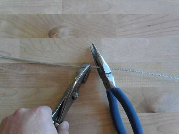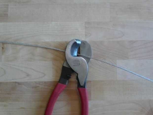 Más fácil utilizar un cortador de cable para hacer esta (se muestra en la primera foto) - su acerca de una herramienta de 10 dólares en la tienda de hardware. Si no quieres recoger uno puede utilizar un cortador de alambre o cualquier otros alicates con una superficie de corte y simplemente intentan poco a poco trabajan su camino a través del cable de acero en un movimiento giratorio circular entre las manos (ver segunda foto). Esto toma tiempo y requiere mucho esfuerzo para ser advertido.