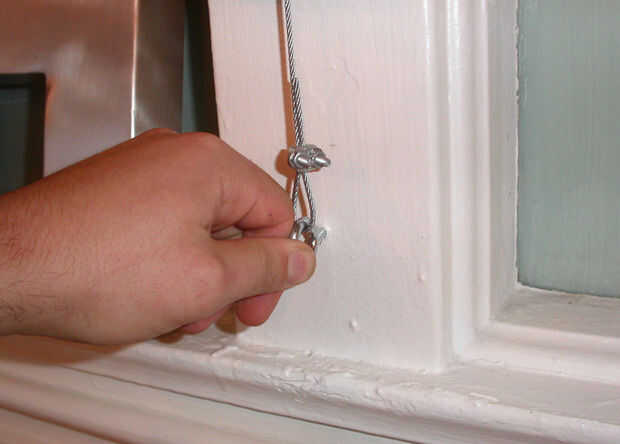 Con un conjunto completo y en lugar de la pared tendrá que colgar el segundo tornillo de ojo. Taladre un orificio guía otro unas pocas pulgadas más cerca al ojo de tornillo original entonces se corta el cable. Corté mi cable de 6 pies de largo, así que puse mi segundo ojo del tornillo aproximadamente 5'10 "de mi primer uno. Colgar el segundo tornillo de ojo.