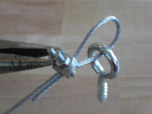 Enrosque el cable primero a través de la abrazadera del cable, luego a través del ojo de tornillo, luego a través de la abrazadera.