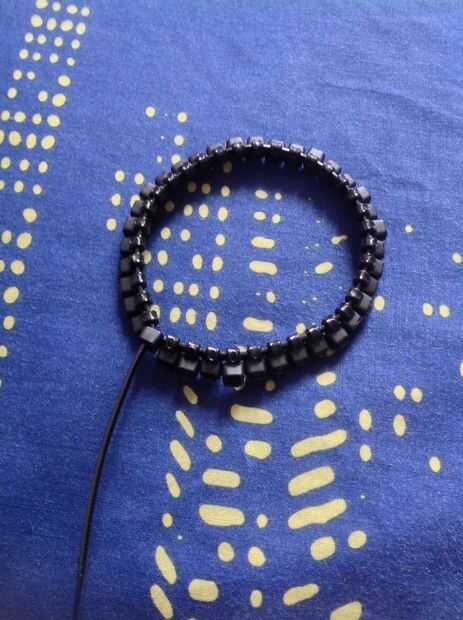 Repita el paso dos hasta que el lazo base completa está enhebrado con vínculos. Si hay un espacio impar al final, tirar la base atar a través hasta que la brecha se ha ido, o liberación la base atar un poco con un alfiler, empujando/tirando hacia atrás el pequeño diente dentro de la boca del empate, lejos de las muescas pequeñas en el lazo y tirando el cuerpo un poco hacia atrás (manteniendo la presión sobre el diente).