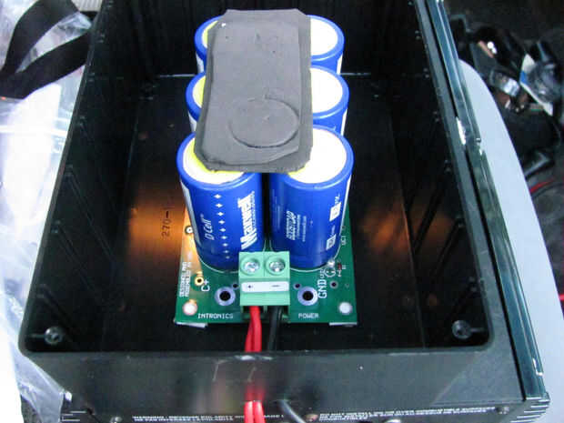 Así que, la primera solución era comprar un 12v condensador estupendo montaje de eBay y Monte al lado del inversor [que se reclina en el asiento delantero la mayoría de las veces]. El montaje de la tapa super que elegí realmente puede arrancar el vehículo. Hay un video de youtube de alguien que empieza como un V8 Dodge Charger con aquella Asamblea. Tiene 6 370F D-tapas y sobretensión/carga de balanceo de circuitos. La Asamblea supercap está ubicada en una caja de plástico proyecto de Radio Shack ya que hay conexión expuesta en la parte inferior de la placa de circuito. Cortocircuitar un 6-pack de tapas 370F haría un bang.