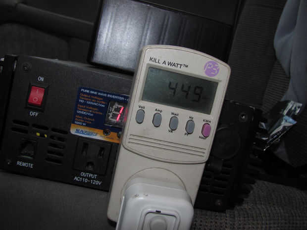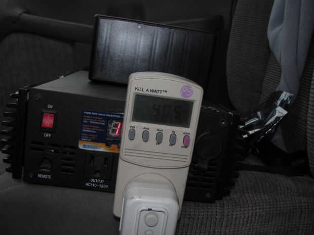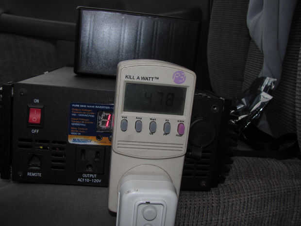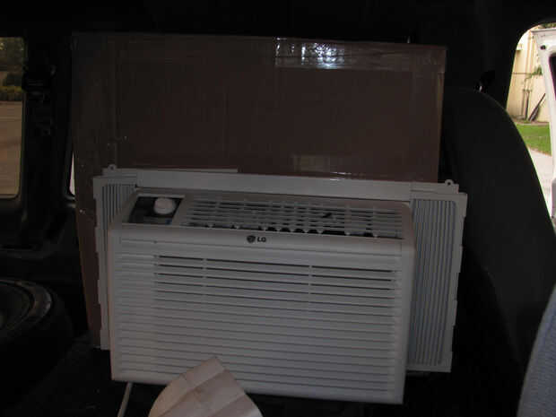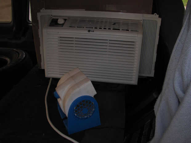 Ahora he colocado el aire acondicionado en una caja y recortar la caja para hacer un pleno cartón para conectar el aire acondicionado a una de las 2 ventanas correderas la furgoneta tiene. Esto pone el aire acondicionado directamente detrás del asiento del conductor. Todavía pueden ver hacia fuera la parte posteriora y los lados para ver el tráfico, pero no puede acceder a los controles del aire acondicionado. El aire acondicionado no tiene mando a distancia control, por lo que el ventilador es bajo y el termostato de la esfera se establece sobre el medio. Cuando encienda el inversor se inicia y funciona el aire acondicionado. La potencia inicial es aproximadamente de 460, pero sube a más de 600 el aire acondicionado se calienta. 600 vatios es el borde de lo que puede ofrecer el alternador de la camioneta y requiere poner la transmisión en neutral y suavemente descanso mi pie en el acelerador cuando deje una luz o en deja de ir tráfico. A 35 kilómetros por hora y encima apenas funciona.