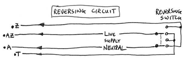 Conmutación inversa nunca debe suceder mientras el motor está conectado a la red eléctrica. La inversión y el arranque y parada del motor son operaciones muy diferentes y deben ocurrir por separado, con el tiempo el motor se detenga, antes de empezar en la dirección opuesta. De hecho, poniendo el interruptor en el circuito de bobina arranque, el interruptor centrífugo interno desconectará la bobina de la red, una vez para arriba para la velocidad, por lo que el interruptor no debe hacer ninguna diferencia; sin embargo, el motor se debe permitir para parar antes de poder aplicar otra vez.