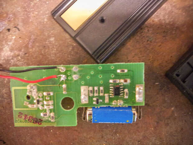 Utilicé mi herramienta dremel para cortar una ranura en mi remota donde los cables del botón de nuevo podían salir substituyó la placa de circuito y cierra la apertura.