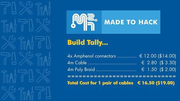 Los conectadores del Amphenol premium cuestan alrededor de 3 Euros, o alrededor de 12 Euros para los cuatro. La longitud del alambre usado totalizó poco menos de 3 Euros. Y por último, la longitud de la manga de poliéster a sólo 1,50 euros. Por lo tanto, el total de un par de alta calidad, cables de interconexión RCA Audio profesionales... 16,50 euros. O casi 100 veces menos costosos que los cables de "audiófilo" bromeé sobre revisión.