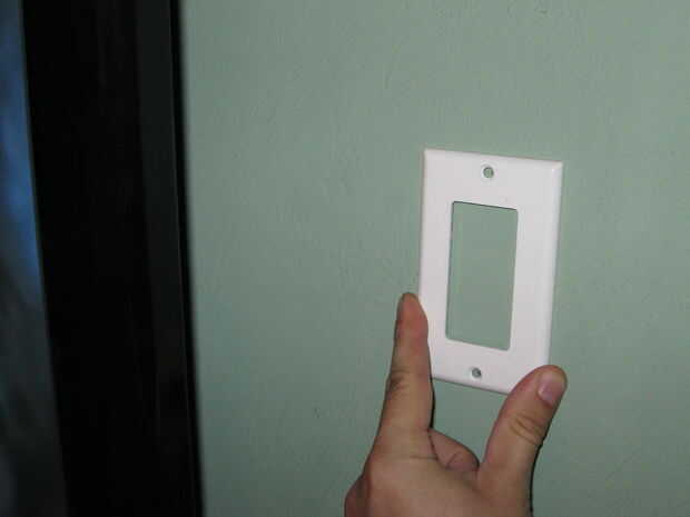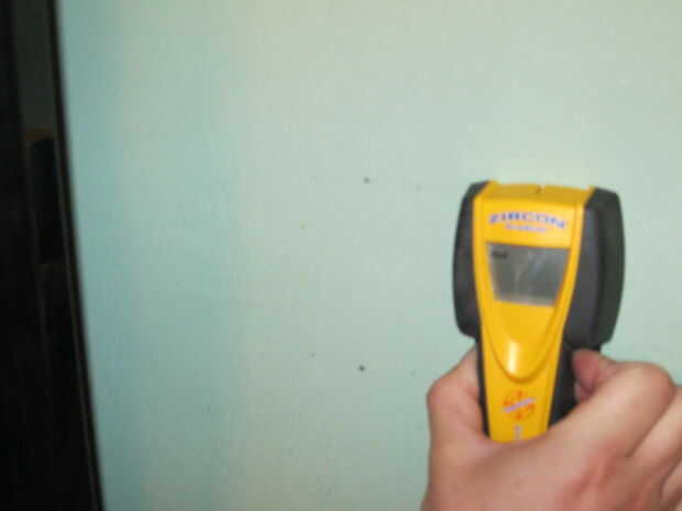 Marque la ubicación con un pedazo de cinta adhesiva o un lápiz. Desea colocar al conector del altavoz cerca del altavoz, pero es necesario comprobar para postes de madera con el detector de montantes. Tuve bastante suerte, sólo uno estaba cerca de un poste de madera y sólo tenía que pasarlo de 1/4" para eliminar. Marque las ubicaciones de la placa frontal con el lápiz en los agujeros de tornillo.