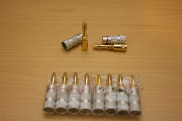 Los enchufes de plátano utiliza tienen un centro de latón que se conecta el cable con dos tornillos. Luego hay una cubierta de aluminio que tornillos sobre la parte superior. La cubierta puede enroscar una vez que el enchufe está instalado en el extremo del cable, por lo que no necesita recordar que Deslice la cubierta sobre el cable antes de que termine, lo cual es muy bueno como siempre me olvide al menos uno de ellos y tienen que volver a hacer la terminación.