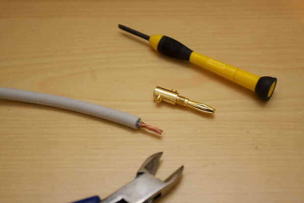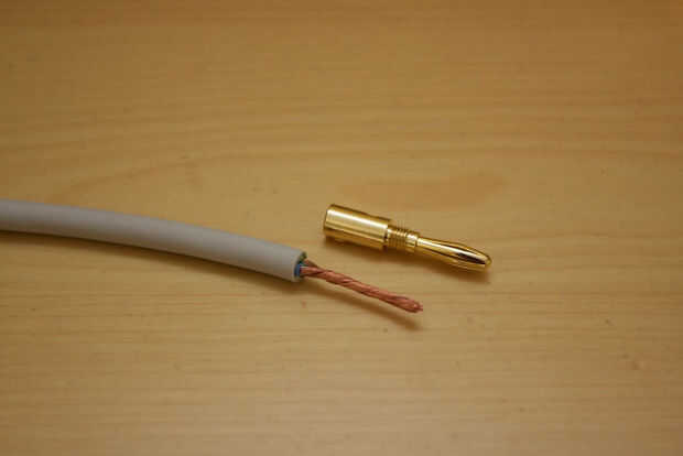 Tuerza los extremos desnudos firmemente y cortar para caber los enchufes de plátano.
