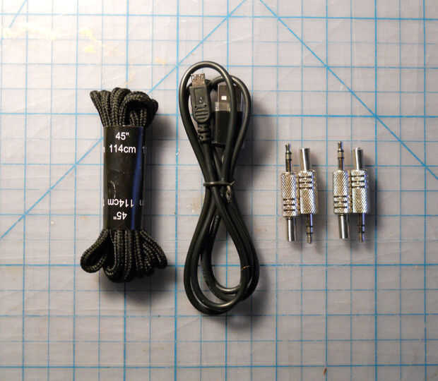 Compré seis clavijas estéreos en línea por menos de $US5, un cordón para $1, y encontré el cable USB en la calle. (La gente a menudo tirar sus viejas impresoras y disponer de un cable USB perfectamente con él ;-) Con estos materiales, hice dos cables de conexión; una cerca de 6 pulgadas y el otro cerca de 2 pies, para aproximadamente $6 dólares, y tengo dos enchufes de sobras. A continuación podrás ver imágenes de ambos cables, como el proceso es el mismo.