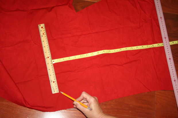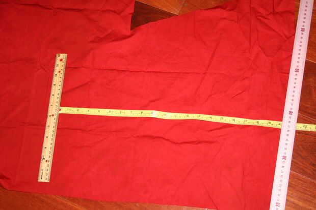 Cuando tengas todo averiguado, dibujarlo en la tela roja. Una vez que las longitudes dibujadas en la tela, conectar la parte superior e inferior en una especie de triángulo con una tapa plana (usted realmente debe mirar las fotos de todos estos pasos, ayudan mucho). Usted también necesitará una U para el perdedor. En el material azul, hacerte una grande en el centro. Tienes suerte de que guesstimate, pero tendrá bastante grande.