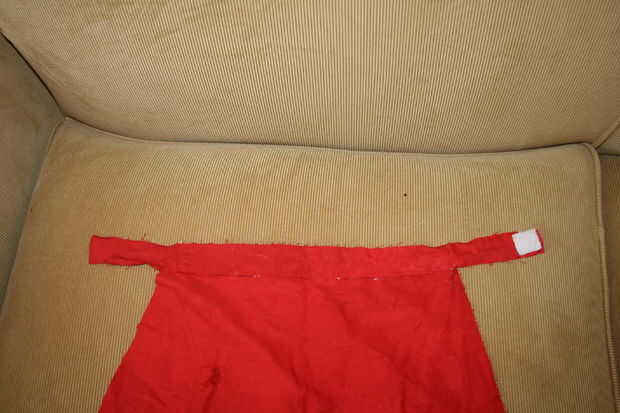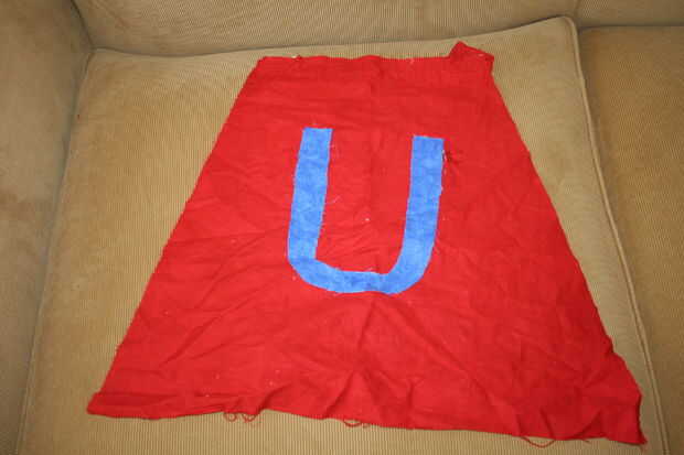 Ahora tienes que pegar todo junto. Tomar la U grande y caliente pegamento justo en el medio. Luego tomar la banda de cuello y cola centrado en la parte más pequeña del cabo. Tomar la tira de vientre y pegar unas tres pulgadas en el centro del cabo (no quieres pegarla alrededor de todo el camino porque entonces no flujo, sólo se pegaría a los lados del perro y eso no es muy heroico).