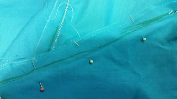 Comienza la Asamblea mediante la colocación de los paneles del cabo juntos, 'right' lados uno frente al otro y los alfileres juntos a lo largo de la línea de costura. Asegúrese de ir sólo por lo que será la costura real. Me pareció lo más fácil de trabajar un par de paneles a la vez. Cubrió uno de los paneles exteriores al que junto a él, lo había cosido, se trasladó a otro panel exterior, había lo había cosido primero cosido un par para el panel central, luego el otro par.