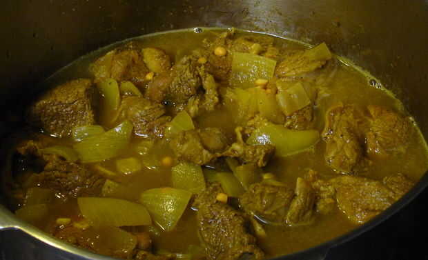 Agregar el resto del polvo de curry y revolver cosas sobre. Cuando empieza a pegar de nuevo agregar el agua y Desglasar otra vez. Vierta agua suficiente para cubrir la carne y deja una taza de agua cerca de la olla para rellenar hierve apagado. Desea que la carne permanezca húmedo durante todo el proceso de cocción.