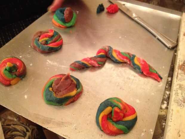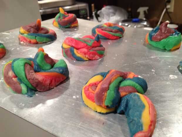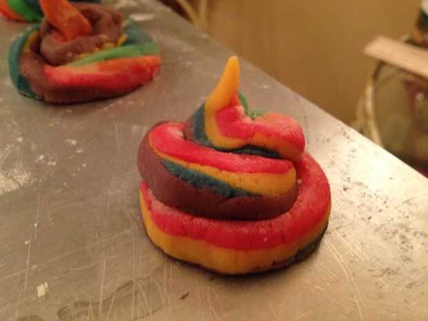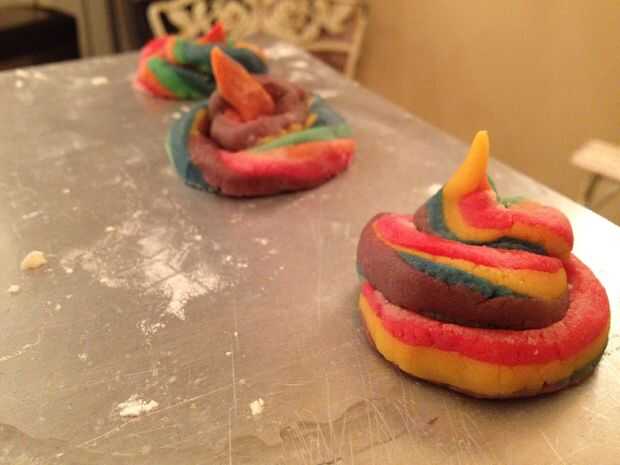 Ahora tienes tus participan arcoíris de caca, hay moldearlos en forma de caca. Esta parte hay hacer muy rápido, pecado de las Naciones Unidas grande margen de error debido a la masa es bastante frágil.