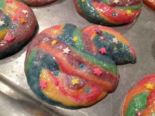 Ahora es el momento de volverte loca/o y sacar estrellas individuales de los sprinkle, colocándolas en las galletas (en colores complementarios, por supuesto). De capa de la la "de exprímelas suavemente para asegurarte" gel las Mantegna en su lugar. No pongas demasiadas estrellas porque quieres las galletas se vean NATURALES... jaja.