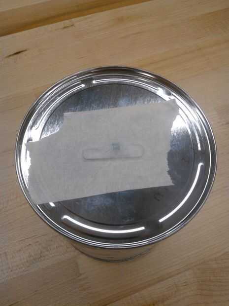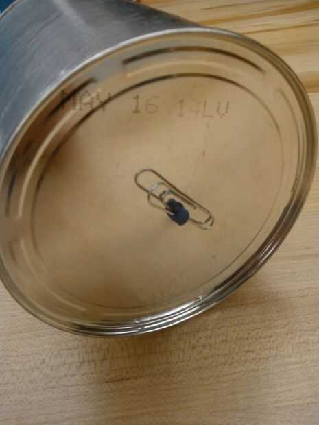 Cuarto paso: enganchar la cinta de goma alrededor de un clip de papel en el exterior de la parte inferior, luego tire bien la goma de dentro de la lata. Luego la cinta contra el poder.