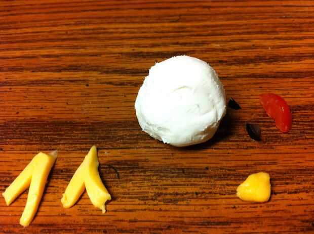 Rodillo su receta de bolas de queso favorito en una bola más pequeña que la galleta de ritz. Si va a utilizar un tomate cherry, aceituna, queso rallado, o rellenos de oliva en el interior entonces le coloque el queso crema alrededor de él y luego rodar en la bola. Cortar dos formas de v de la loncha de queso para cada galleta. Cortar una forma del triángulo de queso en lonchas para cada galleta. Cortar una aceituna en pedazos pequeños para los ojos. (No foto) Cortar unos tomates cherry en rodajas para la parte superior del pollo y por el pico. (No foto)