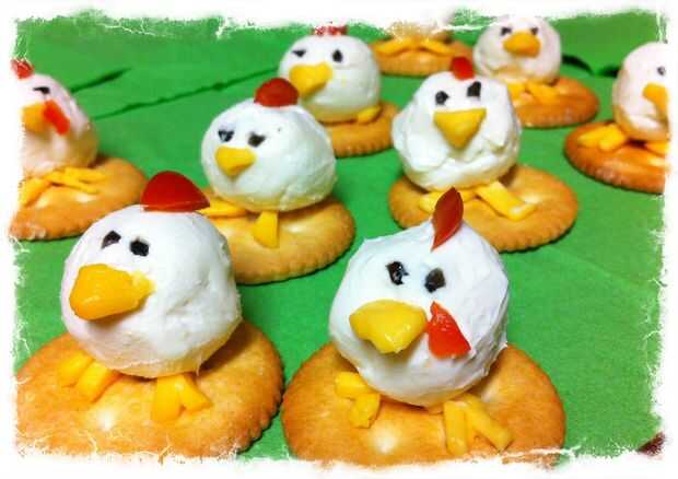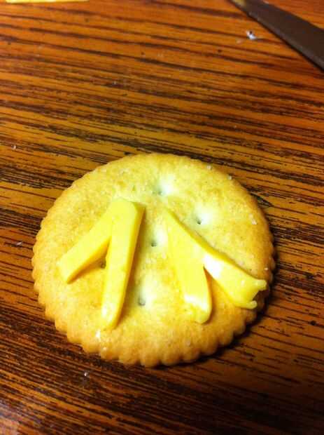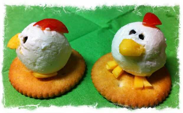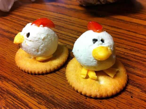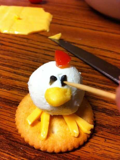Lugar de las dos formas de v encima de la galleta para los pies. Coloque la bola de queso encima de los "pies". Luego coloque una cuña de tomate en la parte superior (para el peine de pollo). A continuación coloque dos piezas de aceitunas para los ojos, usé un palillo de dientes para ayudar a empujar en su lugar. Último Coloque cuidadosamente el triángulo de queso en el pico, y un pedazo de tomate si quieres algunos en el lado del pico. El Cracker cacareando está listo para disfrutar!