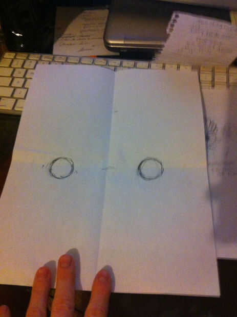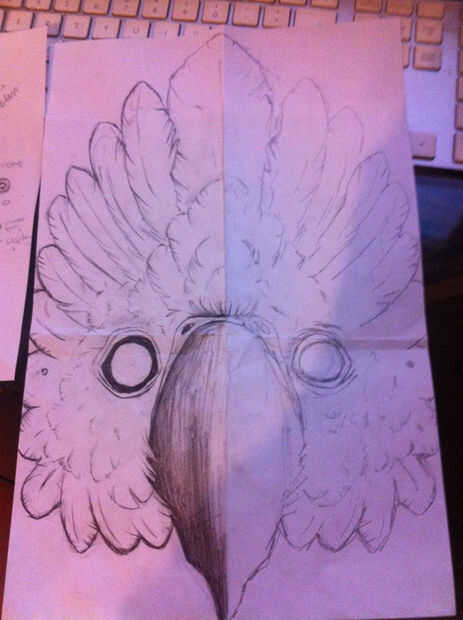 Bosquejo 1/2 del diseño sea del lado izquierdo o derecho. Cuando estés feliz con el detalle, doblar la plantilla como una tarjeta (como se muestra) pulsado o cinta en un equipo con bloc de notas maximizado como lo hice desde que trabajo en la noche (o una ventana bien iluminada) y trazar el lado opuesto para hacer una máscara perfectamente simétrica. Desde allí alteré ligeramente el diseño para tener leves variantes de lado a lado para mantener un natural, pero simétricamente atractiva mirada.