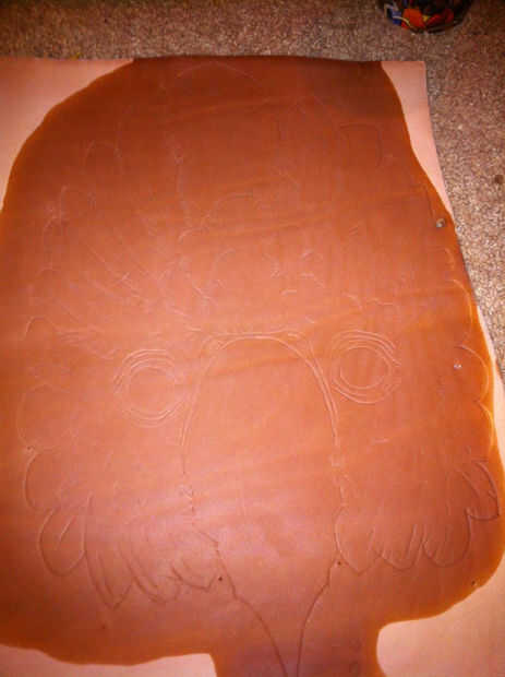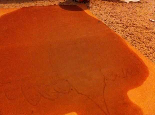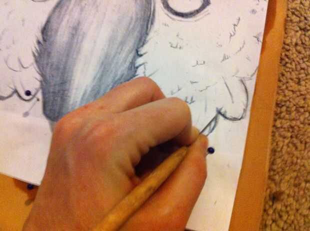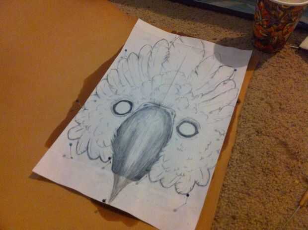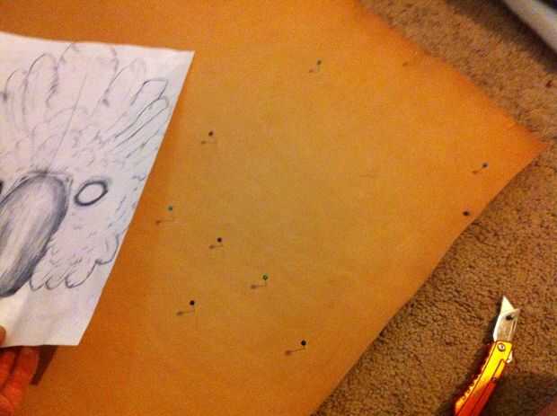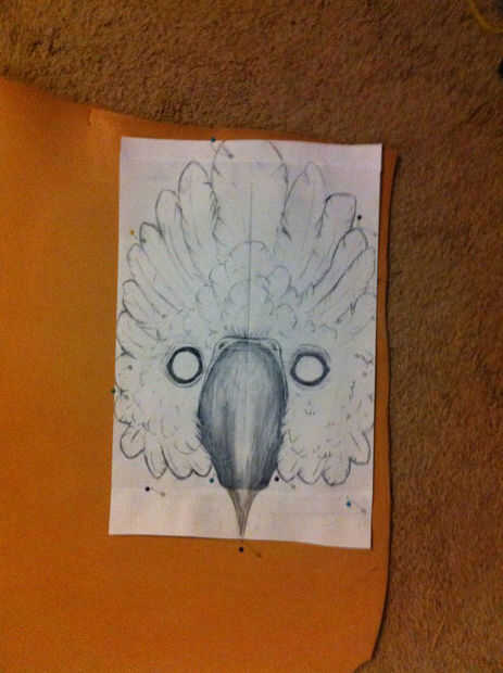 - Después se decide la colocación de su diseño, perno de la plantilla fuera el dibujo al cuero de herramientas usando pernos [fuera del diseño], empuje los pernos a través de la piel para hacer una sangría, luego retire su diseño de cuero y reemplazar las plumas en los agujeros y cuidadosamente empuje a través de la piel para que vean a través del otro lado.
