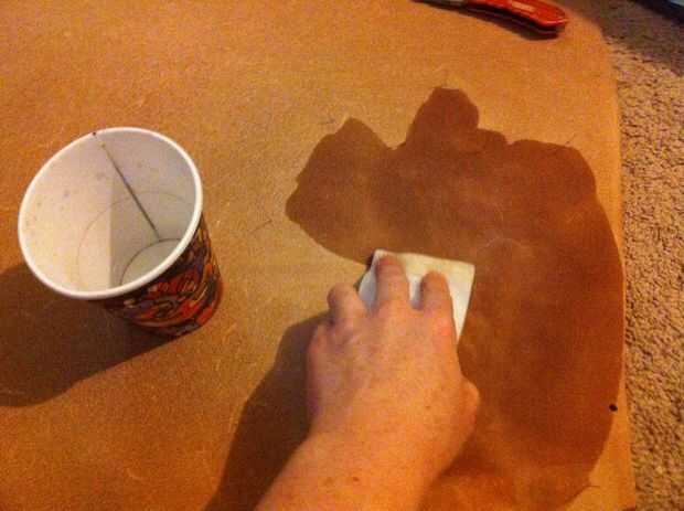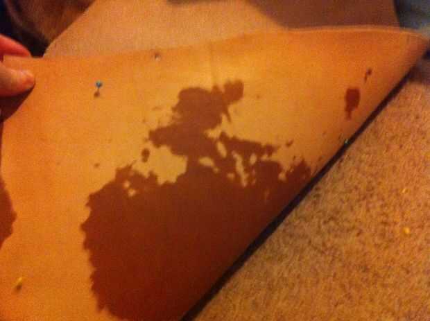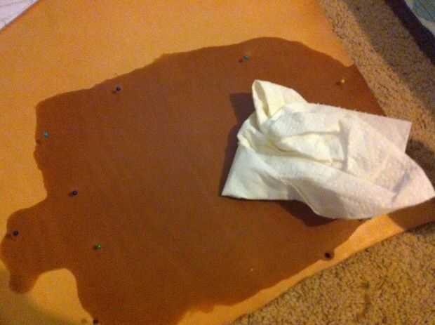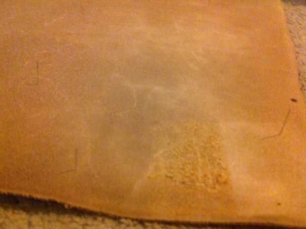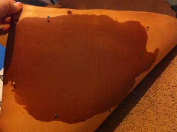 - Voltear su piel sobre y arrastre la esponja mojada por la áspera lado del cuero para mojar el área completa de la plantilla [uso el perno agujeros como una guía donde mojar] - mojado la zona lenta y uniformemente hasta que aparezca humedad en el lado liso (se verá oscuro y húmedo), luego ligeramente blot el lado suave con una toalla para quitar cualquier exceso de agua.