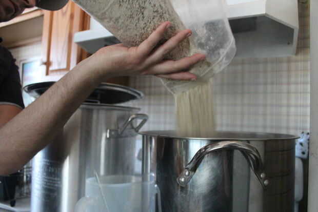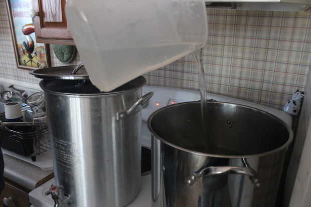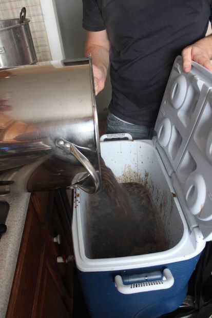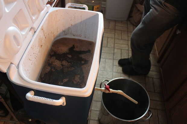 - Hierba (azucarada) se extrae luego el puré. Esto consiste en filtrar el mosto a través de la cama de grano hasta que se convierte en claro (arraigo en la realidad) y luego recoger en tu olla de hervor. Los sedimentos de cama de grano, produciendo un tamiz molecular que se filtra hacia fuera la mayoría de los residuos orgánicos no deseados (grandes proteínas, los lípidos libres, sedimentos, etc.). Usted también necesitará cerca de 5 galones de agua en 170F listo para lavar la cama de grano. Un Consejo útil es filtro/enjuague los granos poco a poco para aumentar la extracción de azúcar. También, tratar de mantener el nivel del agua aproximadamente 1 pulgada por encima de la parte superior de la cama de grano hasta el escurrimiento final para evitar que el grano muy compacto y obstrucción.