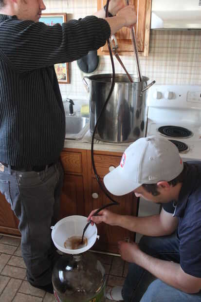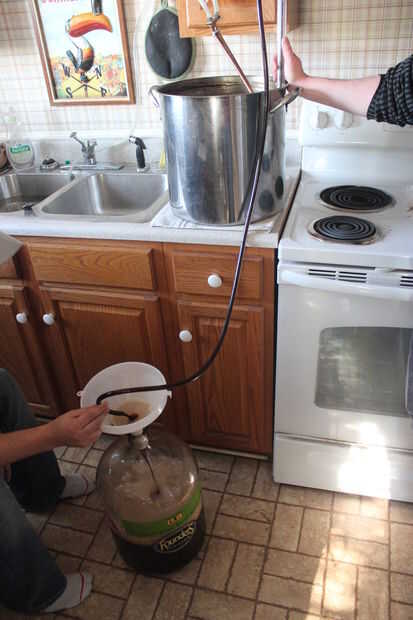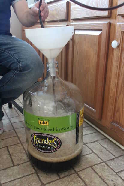 - Sifón la mezcla enfriada en un fermentador para quitar el trub. Sugerencia: Sifón de lado para evitar el trub. Sifón a través de un embudo con un filtro o estopilla ayudarán a quitar trub adicional.