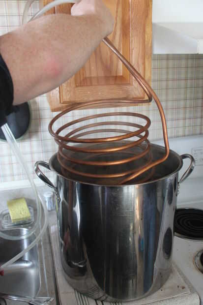 - Cuando el temporizador apaga, crash-cool la mezcla usando un enfriador de mosto. Si no tienes un enfriador de mosto, puede llenar el fregadero o tina con hielo y agua fría y coloque el hervidor hierva en el baño de hielo. Sugerencia: Una agitación vigorosa ayudará a salto de la materia y otros rotura fría (trub *) para recoger en el centro de la olla de hervor.