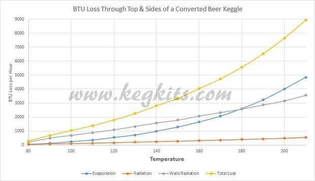 Probablemente notará lo siguiente que es la línea azul cada vez más rápida - esto es la pérdida por evaporación. Y esta pérdida de calor es fácil de evitar manteniendo la tapa de su tanque caliente liqour y pote de hervir hará una enorme diferencia!