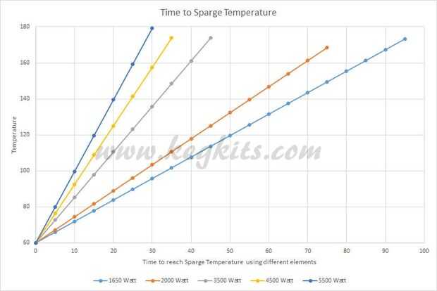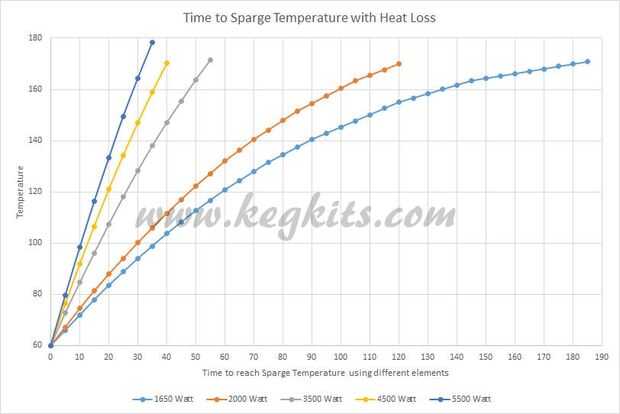 Puedes ver que la pérdida de calor afecta a los elementos de potencia inferiores más. Casi no hay tiempo se añade el elemento de 5500 Watt y el 1650 vatios elemento es expulsado a 185 minutos! En otras palabras, no desea utilizar un elemento de 1650 Watts para lotes de 10 galones. Y en 120 minutos no desea utilizar ya sea un elemento de 2000 vatios.