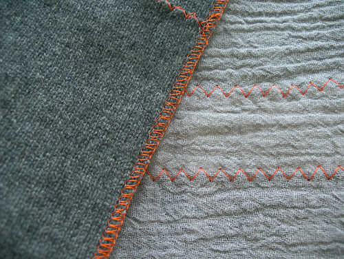 Colocar un material del forro (yo prefiero una gasa de algodón) a la pieza de patchwork. Coser las tiras de Jersey en el respaldo a lo largo de las costuras largo otra vez. En otras palabras, a lo largo de los lados largos de la chompa tiras son 2 puntadas. Coloque el pedazo de Jersey sobre el respaldo, con el lado del suéter hacia arriba. Si se fusionan las costuras ya, no es necesario alfileres o hilván. Sólo tiene que utilizar la zig zag puntada a lo largo de las costuras largo mismo otra vez, reenforcing las costuras. Estos bordes deben ser capaces de soportar el uso y lavado que se han cosido doble y fundido, también.