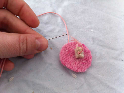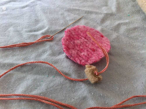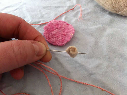 Enrollar un trozo de tela. Un nudo en el hilo de bordado rosa, luego empuje la aguja a través del centro del pequeño rollo de tela, tirando del hilo tenso con el nudo en un lado. Empuje la aguja a través del centro del círculo de lana color rosa.