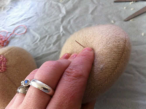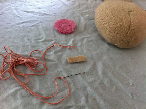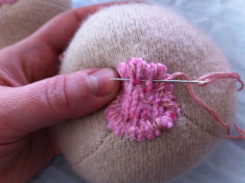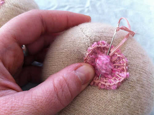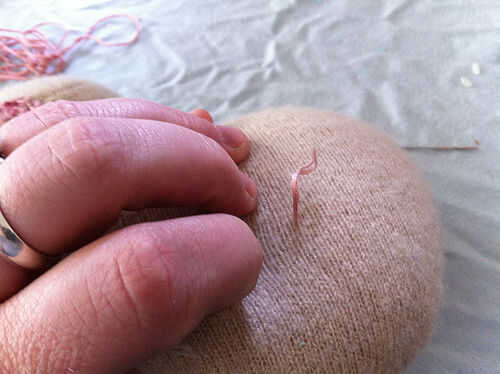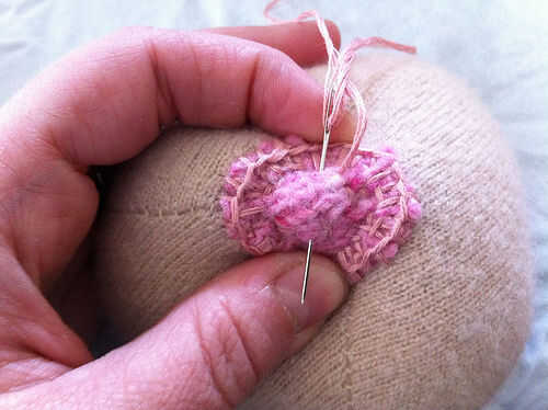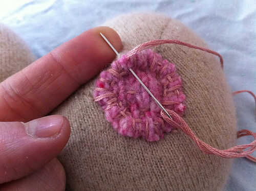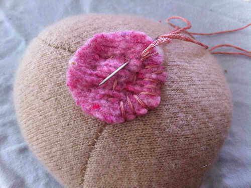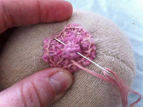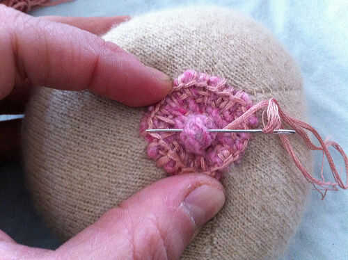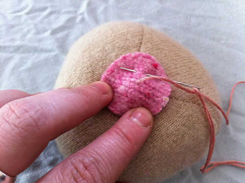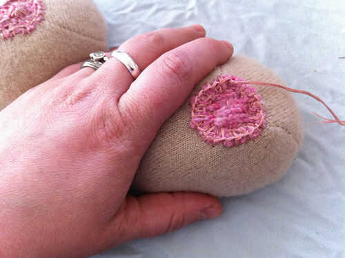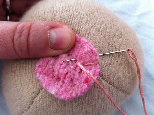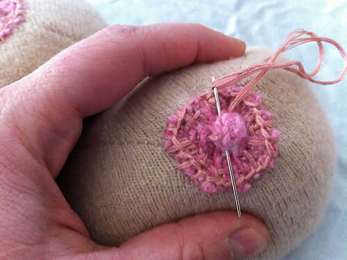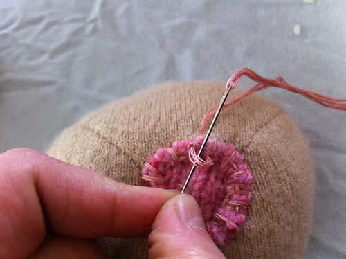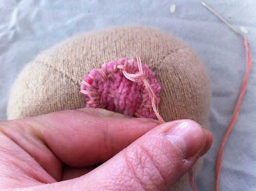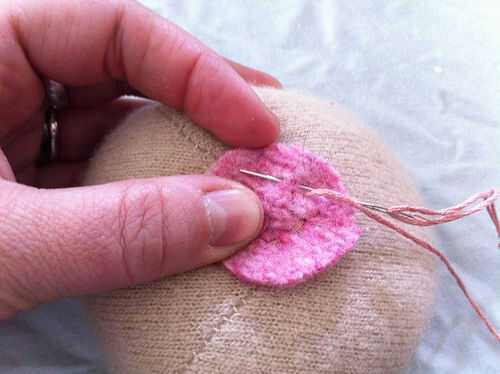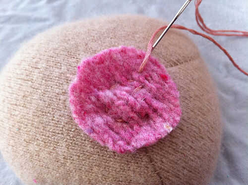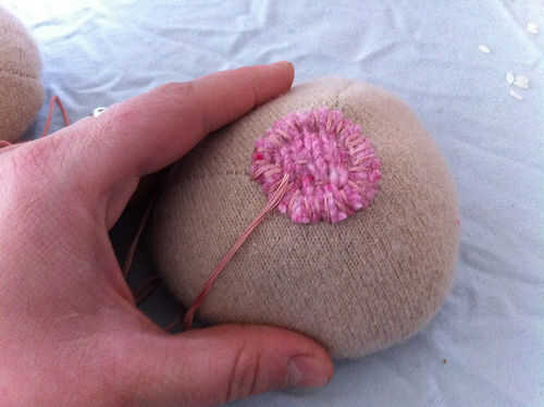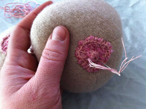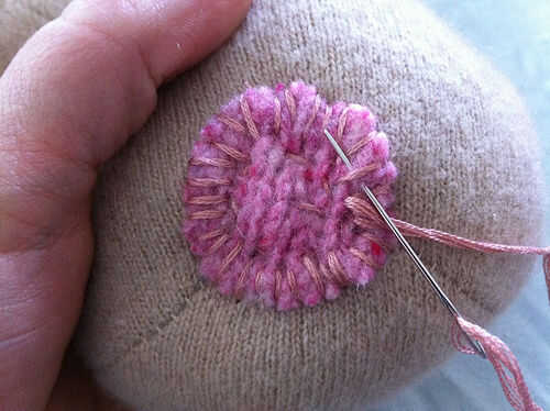 Mantenga el círculo rosa sobre la teta de Cachemira. Puntada hacia abajo en la teta y vuelve a salir el círculo rosado para asegurarlo. Coser el círculo rosado para la base todo el centro levantado de Cachemira. El centro levantado con el rollo de tela bajo la lana forma el pezón.