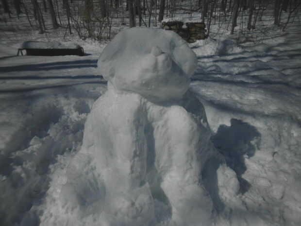 Cuando están formando la cabeza para que se vea como un perro recuerda características importantes como las orejas y el hocico. Aquí tengo floppy oídos a ambos lados de la cabeza de este perrito que se hizo mediante la adición de bolas de nieve en la parte superior de la cabeza (las orejeras de forma mismo cabrían en una cabeza de las personas). Después de que había bastante nieve en la cabeza de las bolas de nieve, luego había alisado lo todo. Antes de que fue alisada hacia fuera, el cachorro de nieve parecía más como un León de la nieve. Es una idea para el próximo año ;)