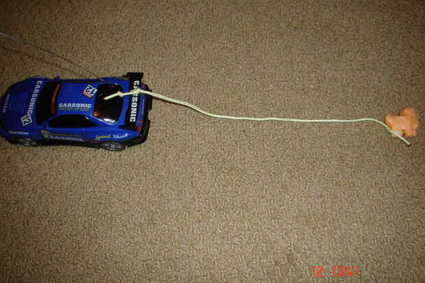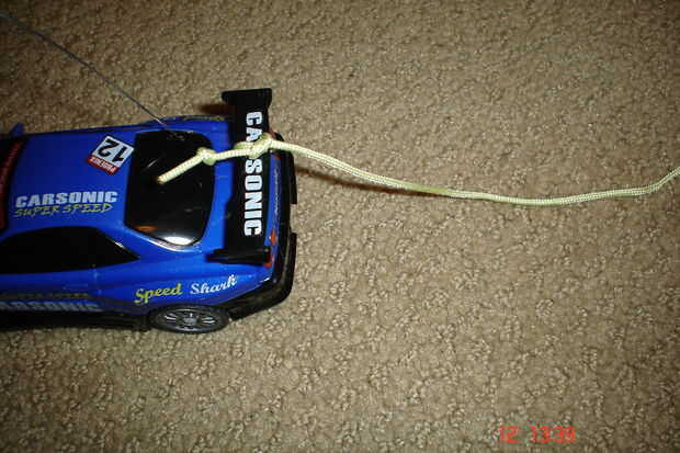 Tome extremo con el nudo y atar al ala del coche. Si no tienes un ala, atar a tope, perfore agujeros,