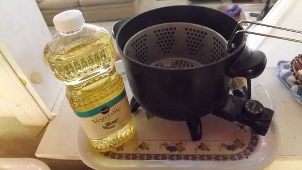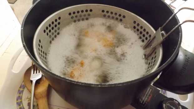 - PRECALIENTA el aceite en una freidora o sartén grande y profunda a 375 grados F. Puesto que el aceite se pondrá muy caliente, deja por lo menos 2" de espacio en la parte superior de la freidora o pan. Es aconsejable que utilice aceite para freír con un punto alto de fumar, como el aceite de maní, girasol o canola. (Yo usé aceite vegetal sin ningún problema).