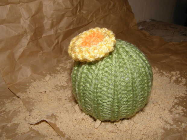 Con hilo amarillo sobre 15 sts.  Trabajo en Liga st de 8 filas.  Corte el hilo amarillo y anaranjado de combinación hilado.  Liga San 2rows.  Cortar el hilo dejando unos 5".  Con aguja de hilo, tejido a través de sts, tire firmemente hacia arriba y seguro.  Con los lados del derecho juntos, whipstitch juntos los extremos de la fila.  La armadura en todos los extremos excepto el elenco amarillo en la cola y el extremo 5" naranja y girar a la derecha hacia fuera.  El elenco de la armadura en cola a través de la fundición en sts, tire firmemente hacia arriba y seguro.  Coloque el molde se reunieron en sts contra el sts se reunieron naranja y pase el extremo naranja estos sts para crear una forma de disco plano.  Coser la flor a la parte superior del cactus.