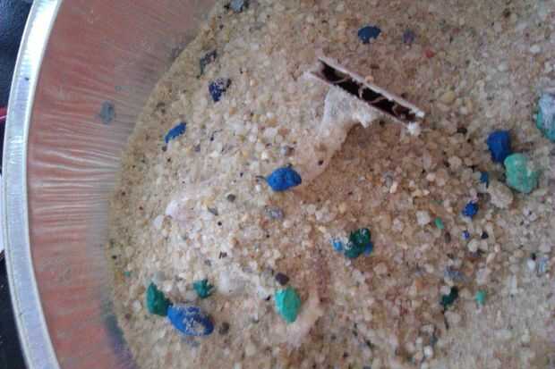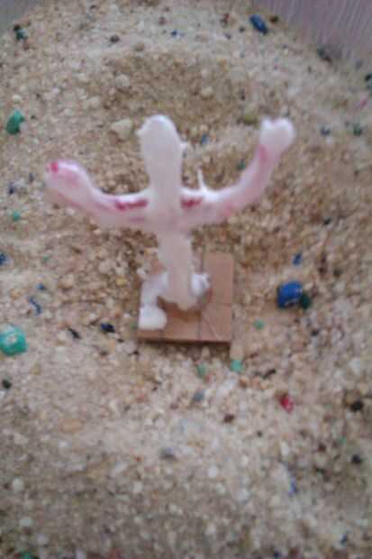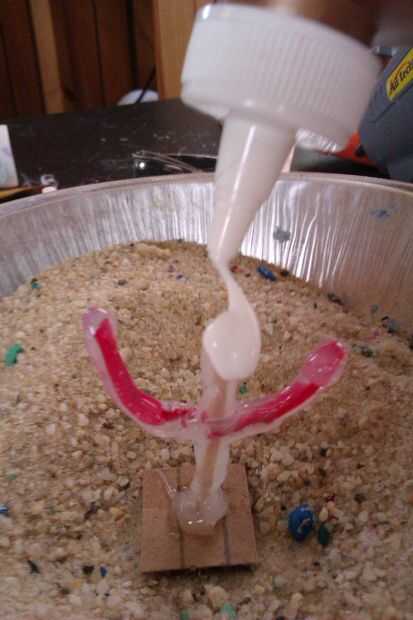 Untar cola blanca todo el cactus y la base. Derramé un montón de arena que tenía en una lata utiliza pastel y enterrado el cactus poco en él. Desea dar una buena capa de cola y una buena capa de arena.