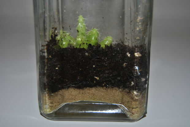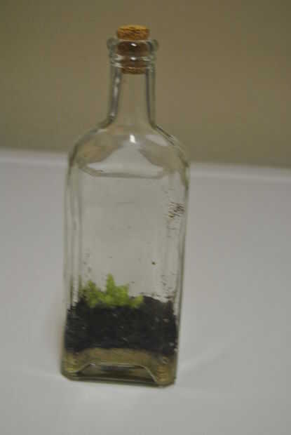 tomar la botella y llenar con dos pulgadas de arena, luego tomar el suelo y llenar hasta aproximadamente una pulgada.