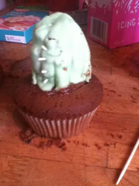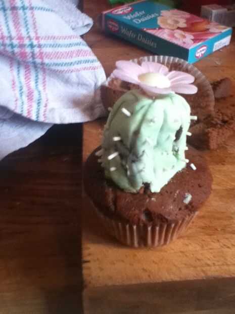 Corte una forma de cilindro de una de las tortas y pegarlos en uno con mermelada. Mezclar el betún con el colorante de alimento verde y cubrir el cactus a continuación, dibuje líneas en él con un palillo. Utilicé hilos sprinkles de azúcar para hacer los picos para mina y tomó las edades, por lo que sería muy bueno escuchar si alguien tiene cualquier ideas.o mejor