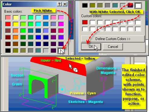 Esquema de color define colores usados para la geometría de referencia, las partes y el fondo de la pieza y el conjunto de espacios de trabajo. Es una forma muy útil para identificar los bordes, caras, dibujos, dimensiones, ratón encima (hover) ubicaciones y selecciones en el área de trabajo.