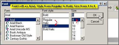 Estoy mostrando cambiando de Arial, Regular y 9pt-a Arial, Bold, 8pt, por ejemplo.
