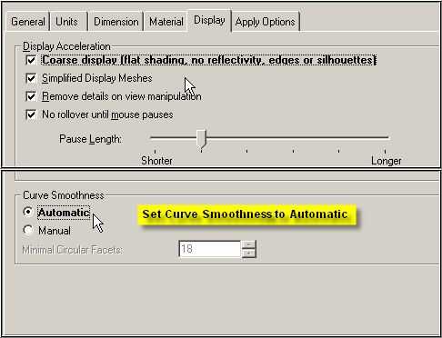 El ajuste de suavidad de curva afecta cómo se muestran las curvas en una pieza o conjunto. Hay dos opciones, manuales y automáticos. Cambiar la selección en automático.