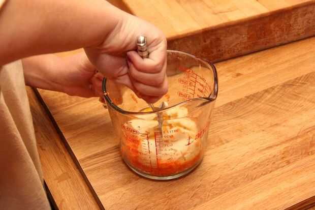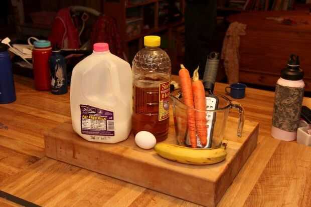 En un tazón pequeño combine todos los ingredientes húmedos, sólo mezclar el plátano hasta que es grueso.