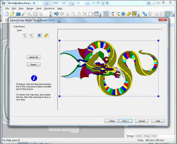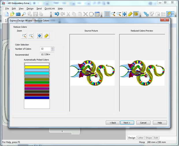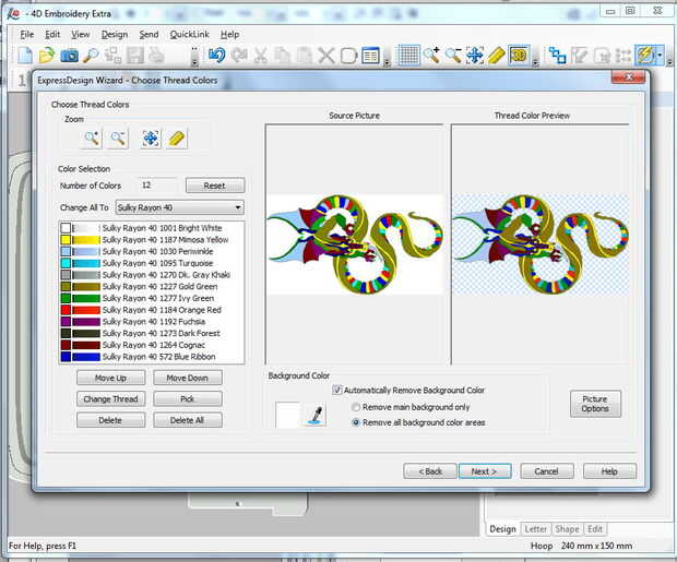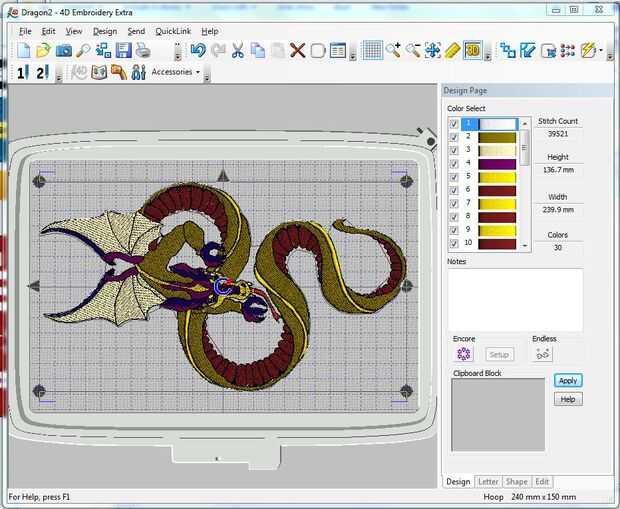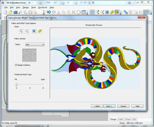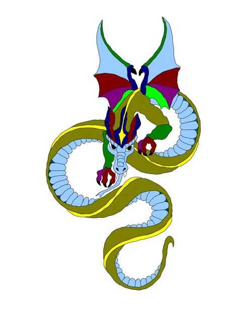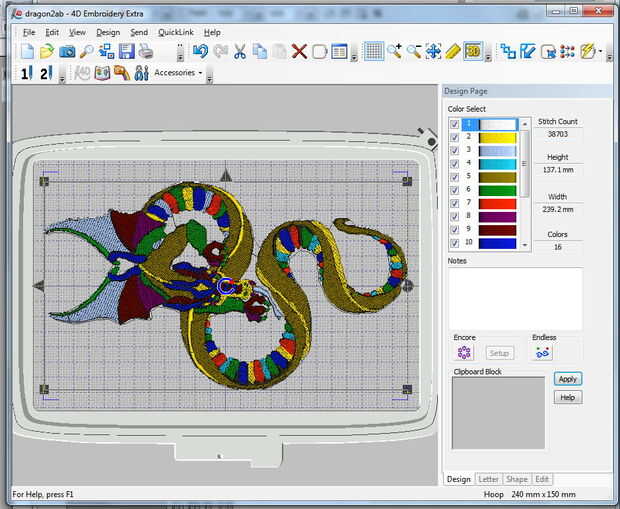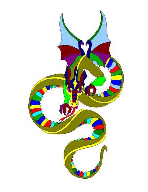 5. una vez que tengo un diseño de imagen decente, color áreas cambiadas para que parezcan como quiero el diseño final coser hacia fuera (Nota: vientre del dragón que en el diseño es marrón oscuro fue cosida en hilo variada)