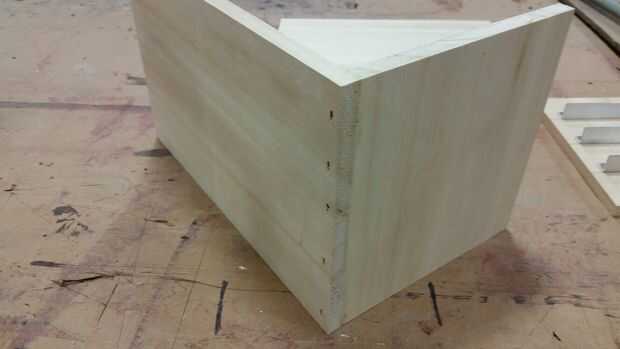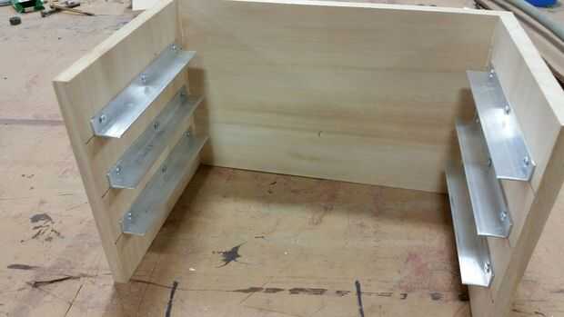Con grapas o tornillos para madera #6 y pegamento, fije los 2 lados a la pared posterior. La pared lateral debe quedar dentro de la pared posterior. en la primera foto que busca en la parte posterior de la pared del fondo a la izquierda y la parte exterior de la pared lateral de la derecha.