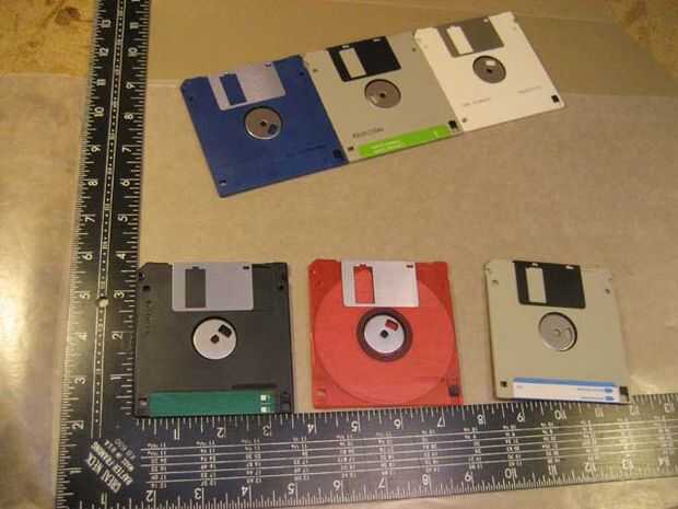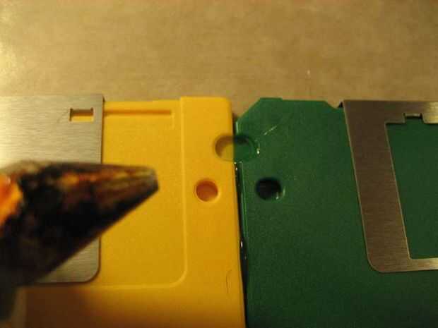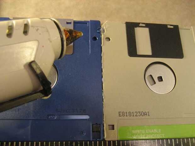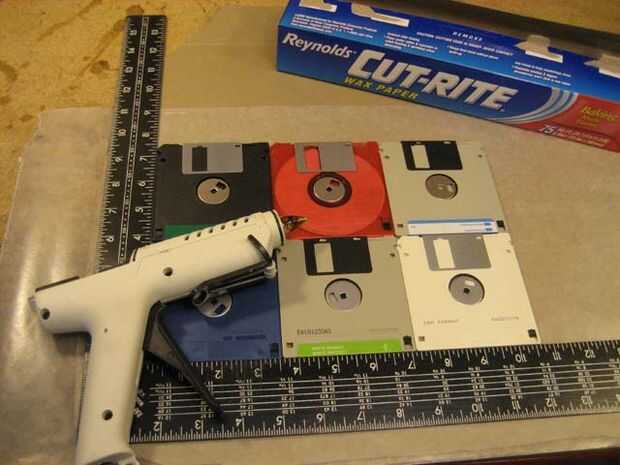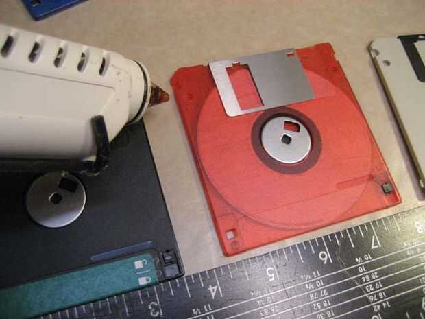 El proceso es sencillo, comenzar colocando un disquete en la esquina de la escuadra de carpintero. Tomar otro disquete y coloque una gota de pegamento caliente en el borde y rápidamente lo tope hasta el disquete que se encuentra en la esquina. Repetir hasta completar un panel.