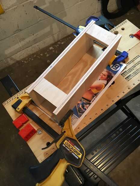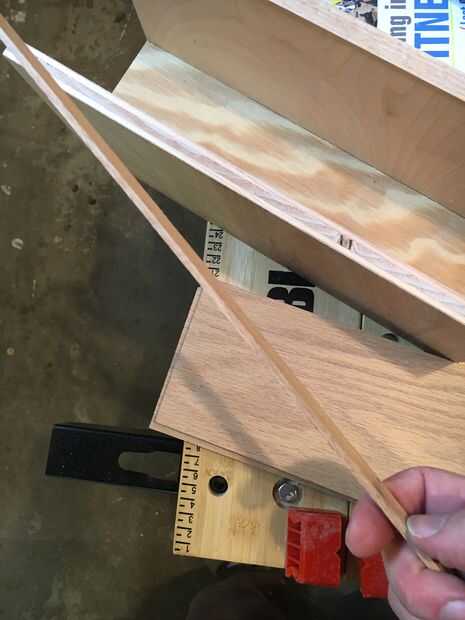 Los lados fueron hechos de retazos de madera de roble. Me uní a ellos en la base con pegamento y clavos. Hice separadores superior mientras se secaba el pegamento para que los lados quedaría perpendiculares a la base. Por último corté una chapa de 1/16" de roble para la parte superior de la madera contrachapada que se vería como el roble.