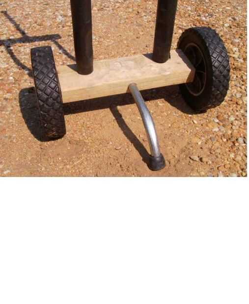 Es la distancia entre los centros de los agujeros de los montantes de metal 7" y sus centros son 1-1/4" desde el borde de la 2 X 4. Los centros de los agujeros para los ejes de rueda (pernos) son 1" desde el borde opuesto de la 2 X 4. El agujero para el pie se centra ambas maneras en el borde de la 2 X 4 más cercano a los orificios para los ejes de rueda.