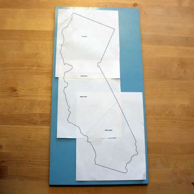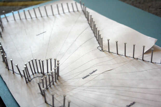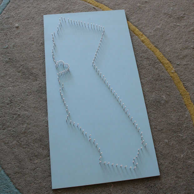 A continuación, coloque el mapa en la cima de la tabla y empezar a clavar a! Coloqué mis uñas sobre apart de 1/2" y el deseo había ponerlos más cerca juntos. Que es difícil porque mis dedos no son mucho más delgados que el y sostiene los clavos en su lugar era complicado!
